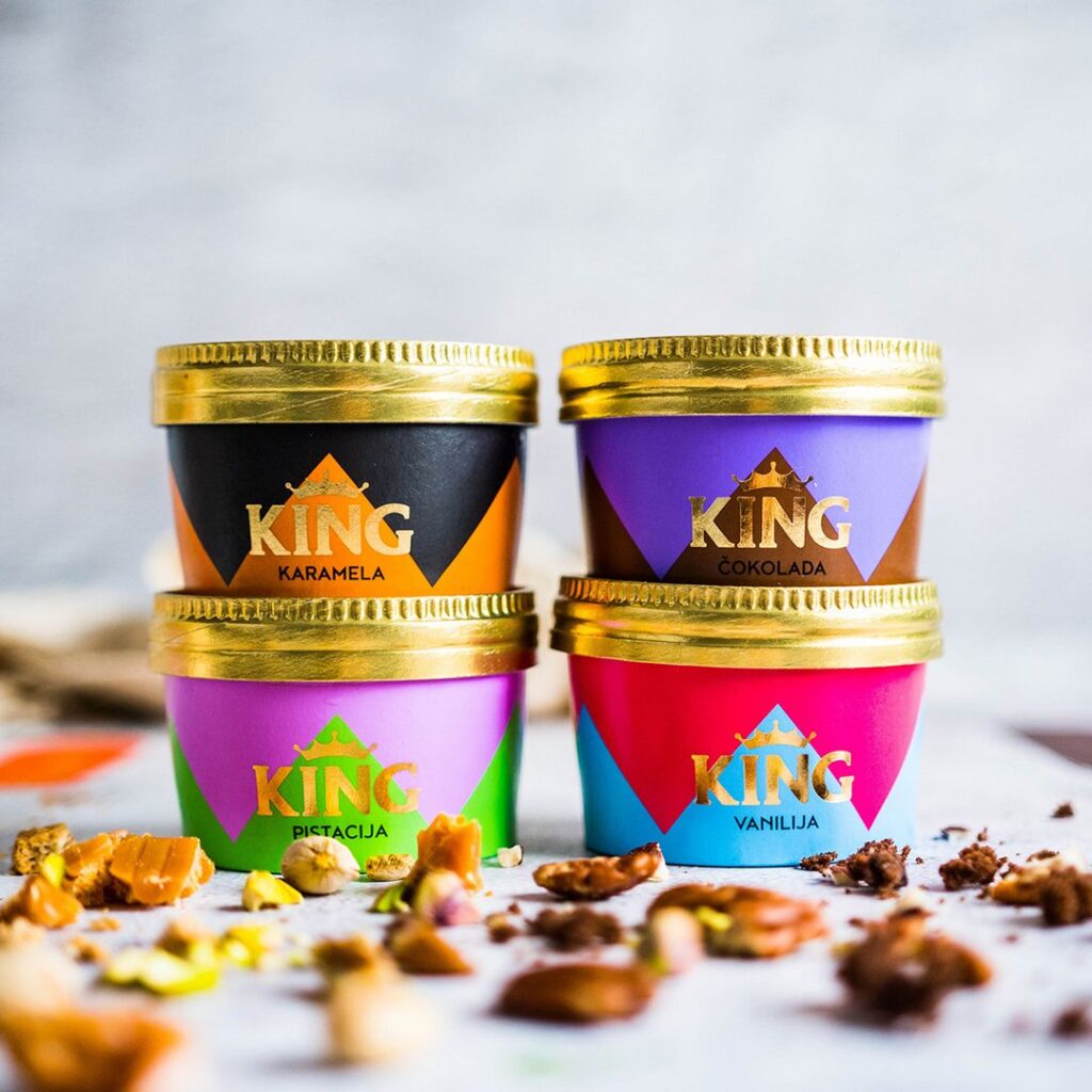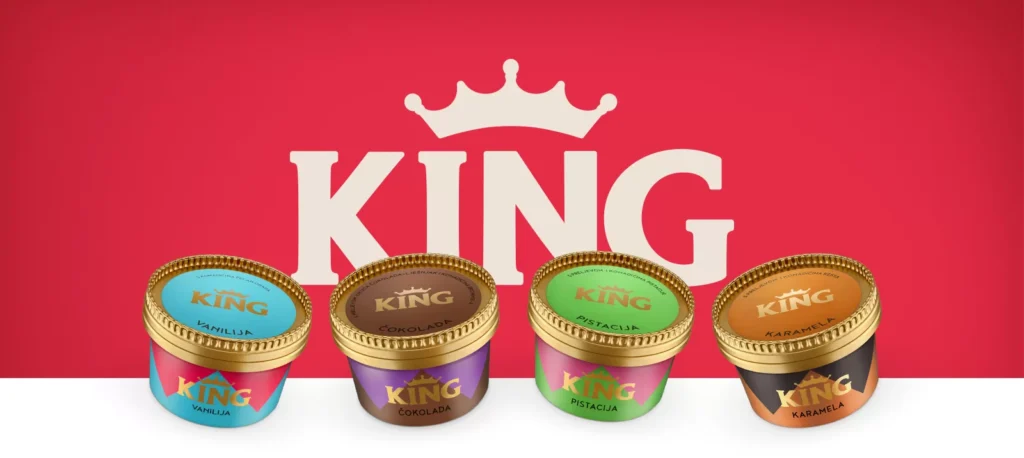 Uz novi okus dolazi i potpuno novo pakiranje u kutiji, dizajnirano da prati moderan način života. Elegantna, praktična i vizualno prepoznatljiva, nova kutija čuva svježinu sladoleda i omogućava jednostavno dijeljenje ili uživanje kad god poželite. Dizajn pakiranja naglašava premium karakter brenda King i jasno komunicira kvalitet koji se nalazi unutra.